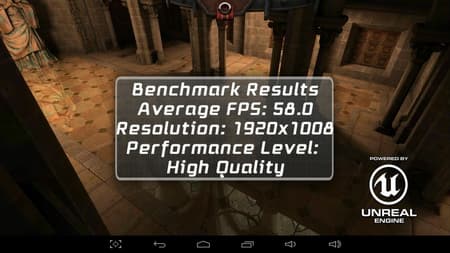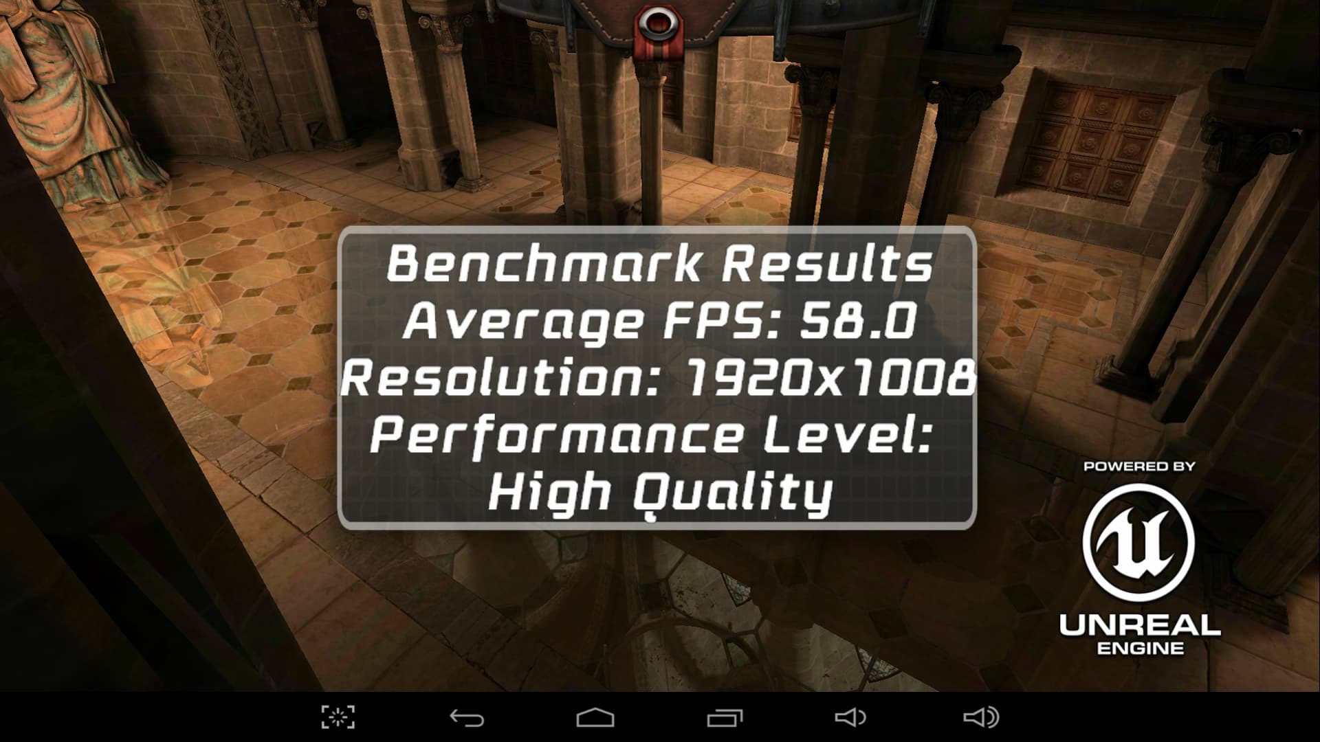 Средняя частота, с которой отображаются сложные 3D-сцены бенчмарка Epic Citadel, составляет 58 кадров в секунду. Больше, собственно, и ни к чему: максимальная частота обновления экранов телевизоров составляет 60 FPS (мы не имеем в виду маркетинговые красивые «100500» кадров в секунду, когда речь идет о работе встроенного программного уплавнителя).