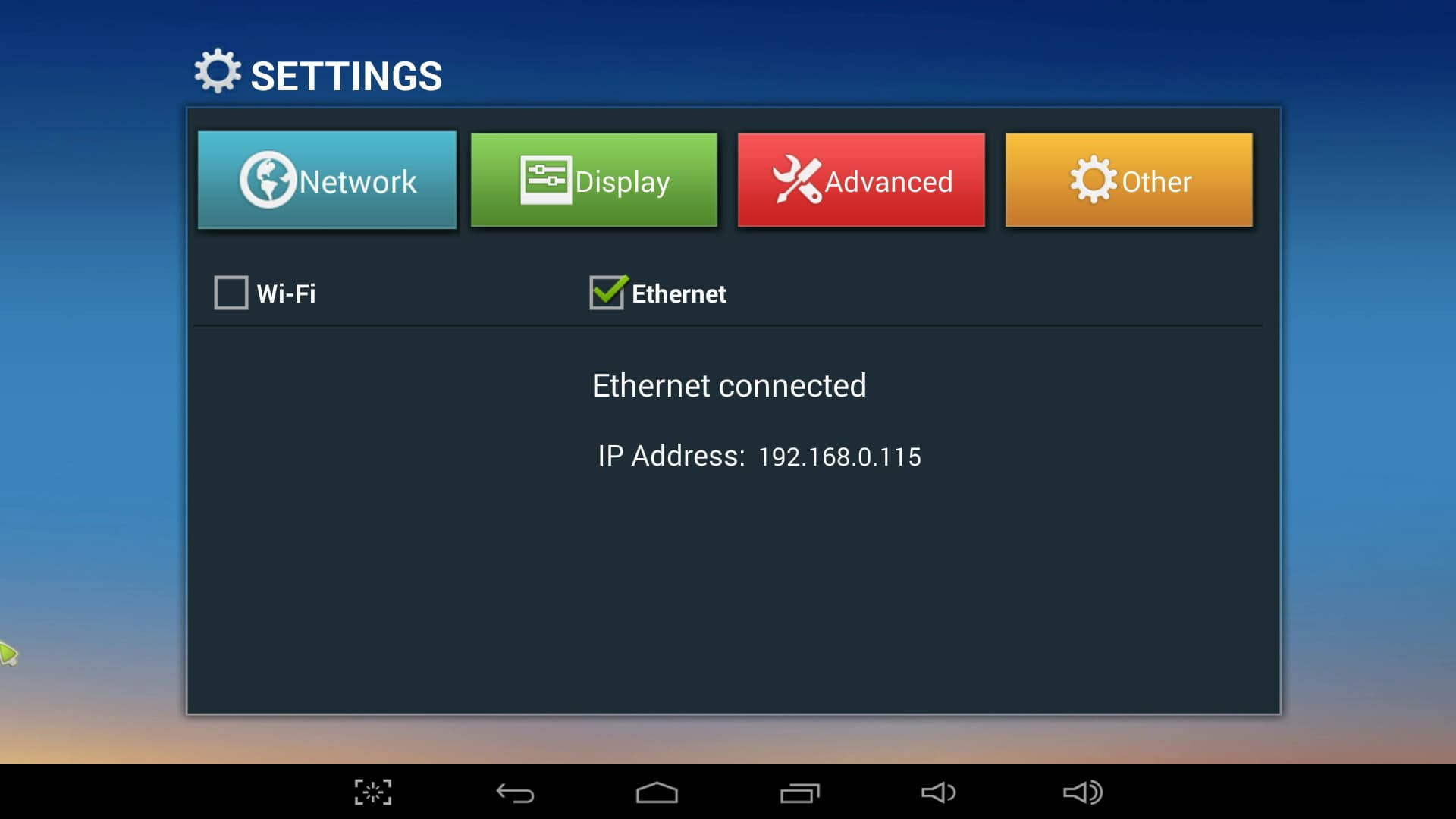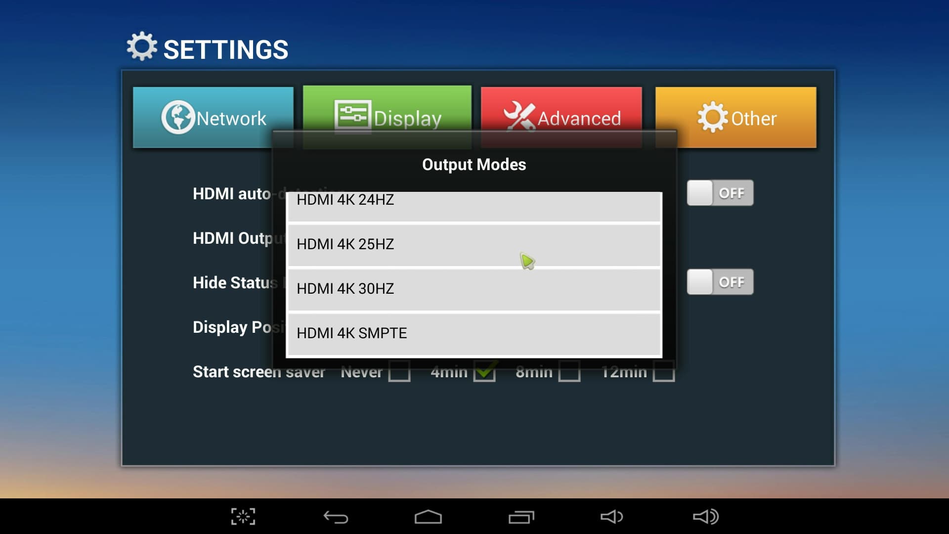 | Сетевые настройки, где выбирается один из доступных способов подключения: проводной и Wi-Fi | Настройки разрешения и частоты кадров выводимого сигнала |