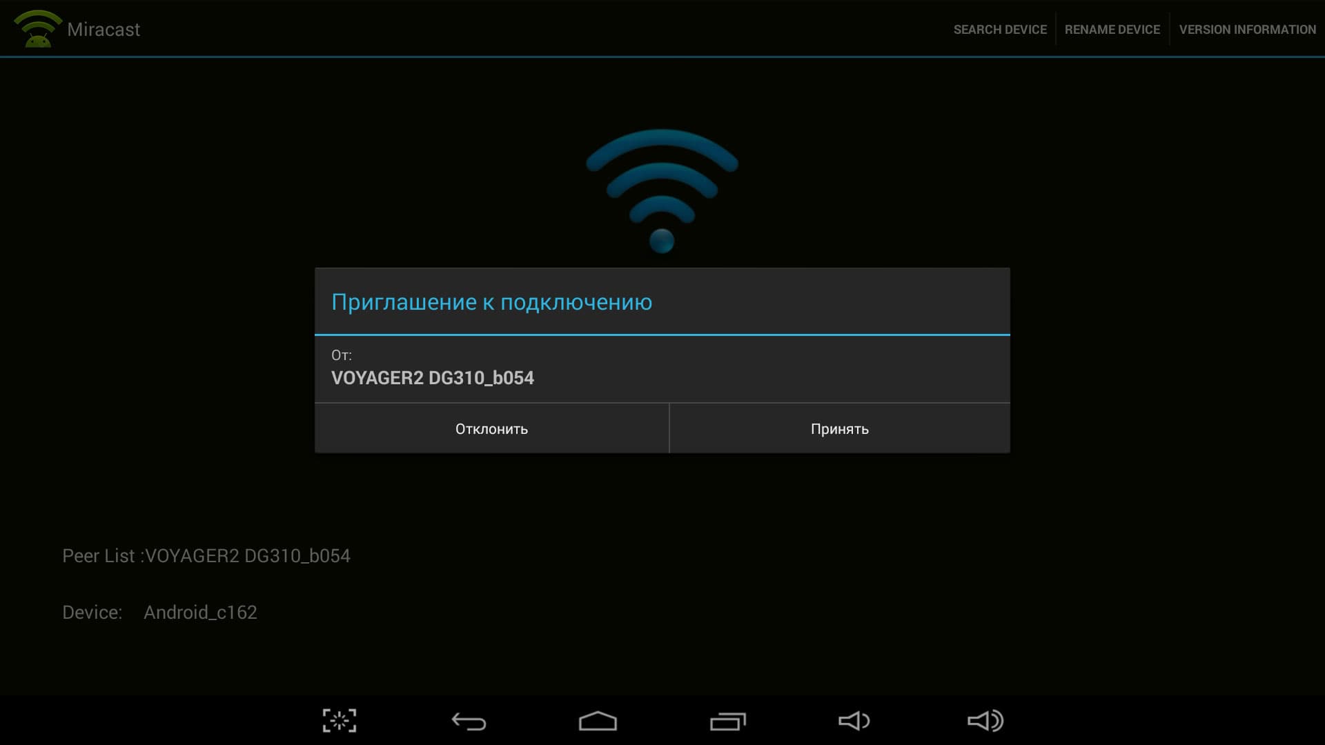 Iconbit Toucan Nano 4K может быть еще и приемником сигнала. Процесс соединения смартфона с рассматриваемой приставкой показан на следующих скиншотах. При подключении смартфона с именем Voyager к приставке последняя представляется ему как устройство с названием Android_c162.