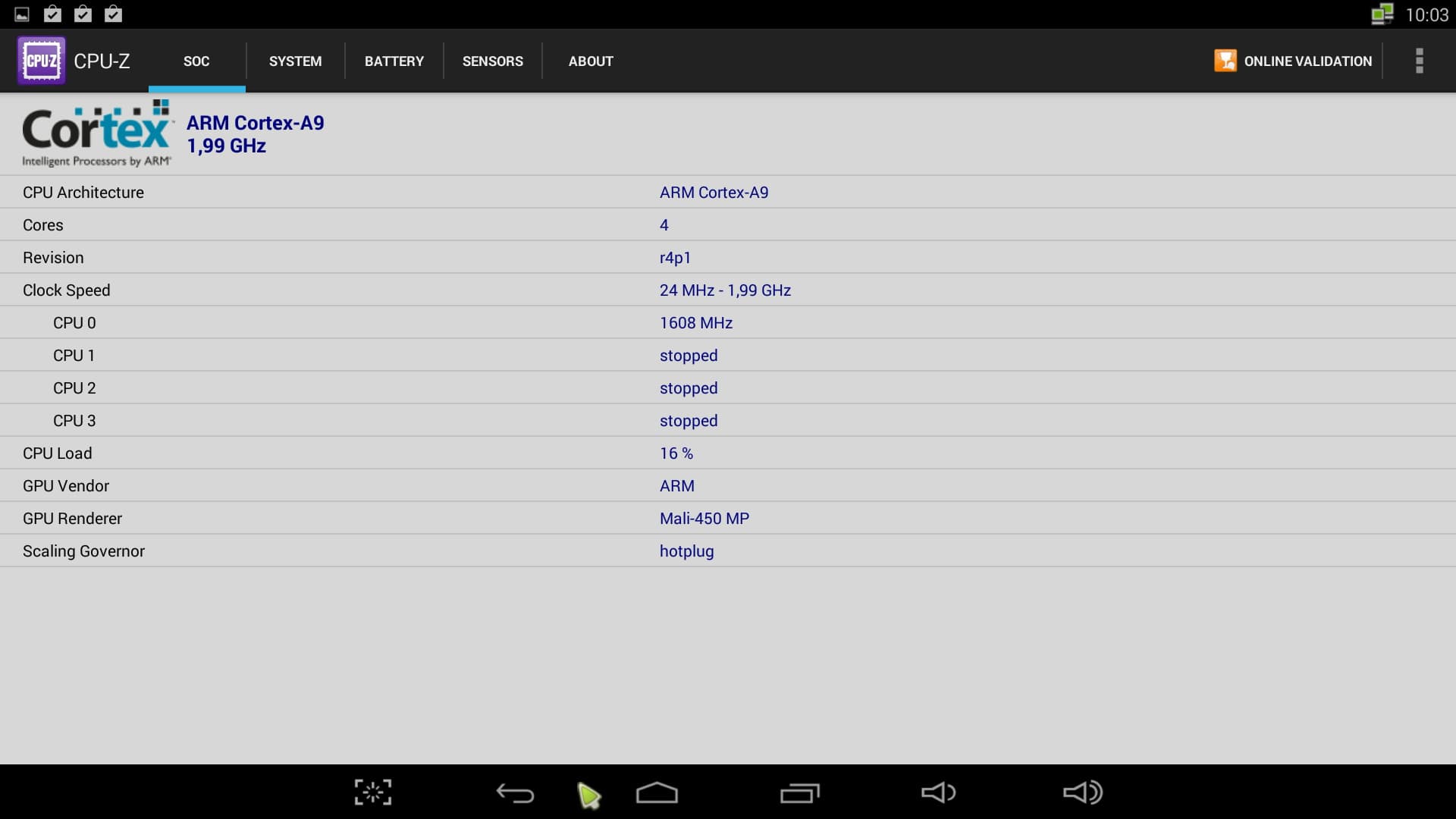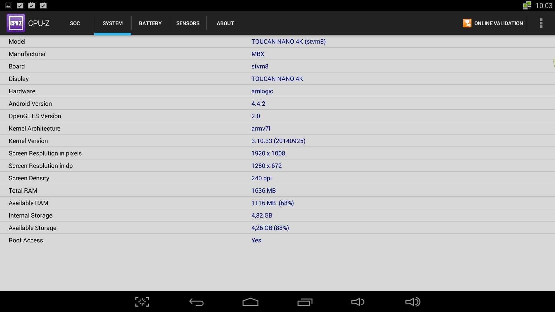 Более подробные сведения о начинке Android-устройств традиционно дают сторонние приложения, например, CPU-Z. Единственное, к чему здесь можно и нужно относиться критически — это к информации об экране. Как о его разрешении, размере, так и о плотности пикселей. Ну откуда устройство может знать о плотности пикселей подключенного телевизора — и тем более устройства захвата, у которого экран отсутствует в принципе... Как и прежде в случаях с Android-устройствами, не имеющими встроенных экранов, эта информация берется из показаний встроенного в систему программного эмулятора экрана.