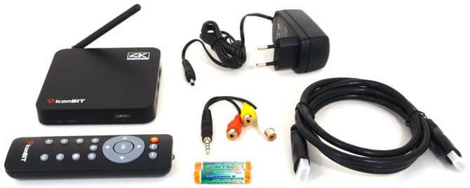 Рассматриваемый аппарат комплектуется сетевым адаптером питания, инфракрасным пультом ДУ с батарейками, HDMI-кабелем и переходником для вывода композитного видеосигнала вместе с аналоговым стереозвуком.