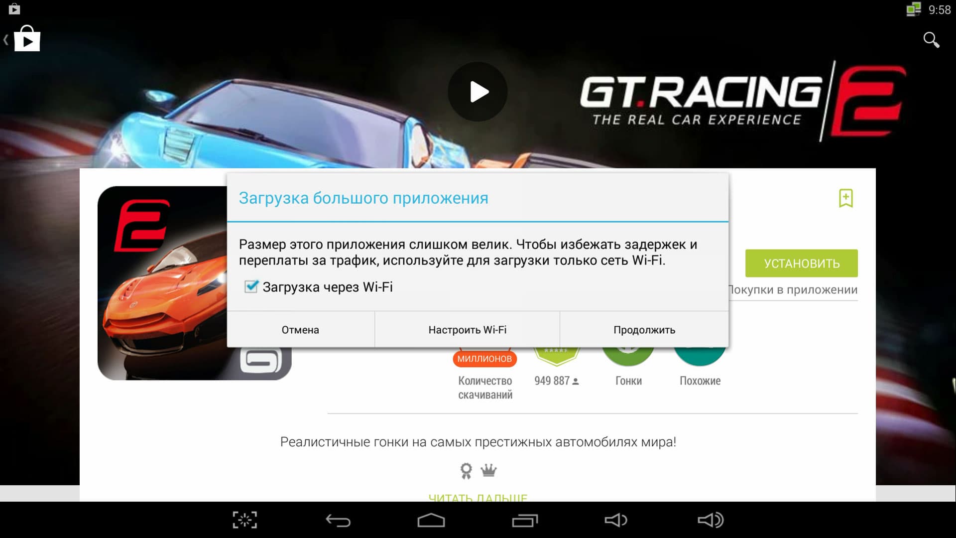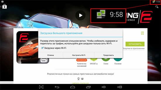 Поведение же конкретных приложений полностью зависит от фантазии их разработчиков: догадывались они о существовании устройств с проводным соединением или нет? Если не догадывались, то такое приложение откажется работать с проводной сетью и будет настойчиво требовать Wi-Fi-подключения. Так, к примеру, чтобы скачать емкий дистрибутив какой-то игры, Google Play попросит активировать Wi-Fi связь, не догадываясь, что текущее проводное соединение вполне бесплатно и может иметь даже более высокую скорость. Ниже приведен скриншот, отображающий такую типичную ситуацию, когда при наличии скоростного проводного соединения приложение выражает заботу о сохранности кошелька пользователя.