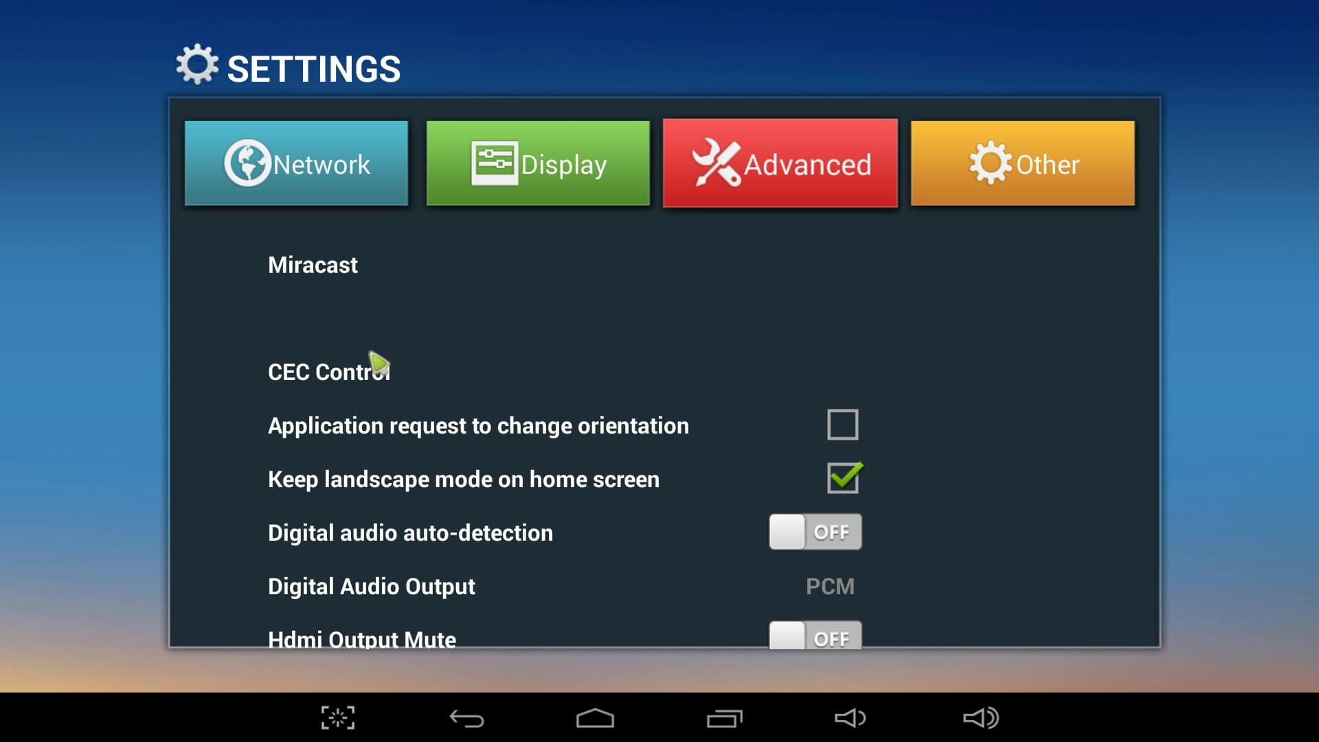 | Дополнительные настройки, включающие также возможность управления устройством через шину HDMI (CEC control) | Прочие настройки, в том числе параметры вывода звука |