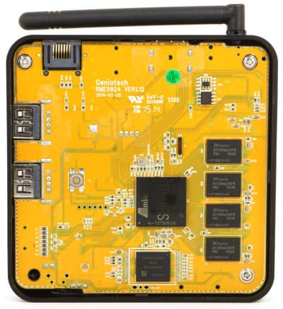 Печатная плата занимает весь внутренний объем устройства, здесь можно видеть микросхему памяти производства SanDisk, четыре микросхемы памяти Hynix и центральный процессор Amlogic. Для увеличения эффективности теплопередачи от процессора к металлической пластине служит клейкая прокладка.
