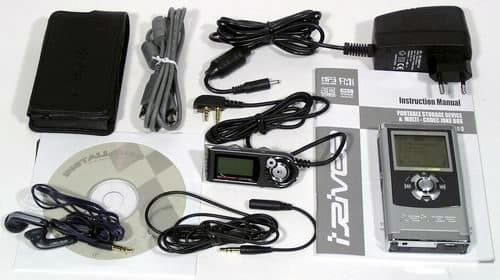 Сам плеер, интерфейсный кабель USB, чехол, блок питания, пульт ДУ, аудио кабель, переходник для подключения сторонних наушников, наушники, CD с ПО и подробная инструкция по эксплуатации.