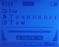 При проигрывании композиции тэг демонстрируется в виде бегущей строки, предпочтение отдается старшим версиям тэгов. Максимальная длинна тэга составляет 60 символов. К сожалению, несмотря на то, что в некоторых плеерах шрифт, который используется для отображения русского языка, был оптимизирован, в данном устройстве все еще используется старая версия шрифта. Увы, буквы в русских тэгах выглядит слишком крупными, что вызывает дискомфорт при просмотре.