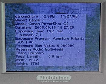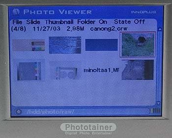 Вот мы и добрались до наиболее мощных возможностей Phototainer с учетом основной сферы применения устройства, данная функция крайне важна. К сожалению, как я уже сказал выше, несколько подкачал экран, но ведь можно воспользоваться и TV-выходом. Да и, в любом случае, встроенный дисплей больше, нежели те, которыми снабжены цифровые фотокамеры, так что даже на нем можно разглядеть что-нибудь важное.