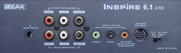 Комплект колоночек Inspire 6700 при субъективном тестировании подключался к звуковой карте Creative Audigy2. Подключение происходило комплектующимся проводом с тремя разъемами мини-джек на концах. Передеча сигнала на седьмой сателлит обеспечивается посредством трехконтактного разъема мини-джек. Так что подключить набор к 6.1 или 7.1 карте не от Creative затруднительно.