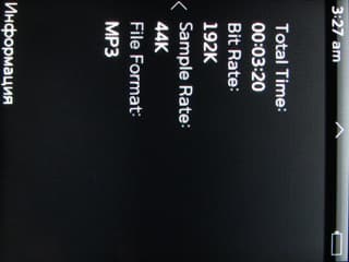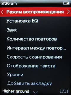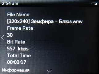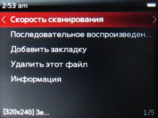 Во всех функциях, будь то музыка, видео, фото, текст — меню настроек вызывается долгим нажатием «вправо». Для видео можно настроить скорость сканирования, а также установить закладку. Также доступна информация о ролике, в которую входят: имя файла, частота кадров, битрейт, длительность ролика, а также его размер.