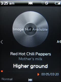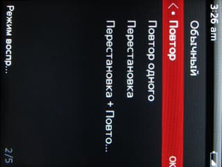 Во время воспроизведения на экране присутствуют: картинка альбома, имя артиста, название альбома, название песни, полоса прогресса, режим эквалайзера, часы, заряд батареи, текущий режим воспроизведения. Треки переключаются не как обычно, нажатием вперед/назад, а кнопками вверх/вниз. Кнопка «влево» возвращает нас в библиотеку, а «вправо» при долгом нажатии открывает обширное меню настроек.