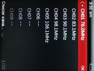 В такого класса плеере не может не быть приемника. Плееры от iRiver, к счастью, не брезгуют данной функцией и снабжают ею практически все свои плееры, даже лишенные экрана (iRiver s7, например). Качество приема у E100 вполне приличное. Разумеется, присутствует возможность делать предустановки. К сожалению, их можно сделать всего 20, но потратить один раз 10 минут времени на поиск самых нужных — не такая сложная задача. Настройку можно производить как в ручном, так и в автоматическом режиме. Удобно то, что можно просматривать список предустановок. Имеется возможность выбора региона. Для Европейского региона диапазон начинается с 87,50 МГц и шаг при этом 0,5. При выборе Японского региона список частот начинается с 76 МГц, но шаг — 1 МГц.