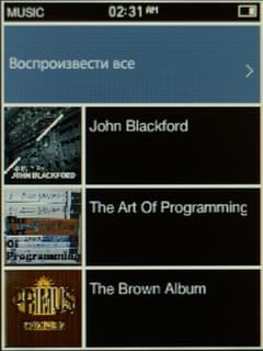 При перемещениях по библиотеке рядом с названием альбомов отображаются их обложки. После выбора какого-то исполнителя необязательно выбирать конкретный альбом, можно воспроизвести все треки исполнителя.