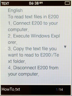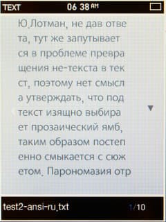 Поддерживаются файлы формата TXT. Русский текст наиболее корректно поддерживается, если он в кодировке ANSI. В других кодировках он отображается на пол-экрана, узким столбиком. Как ни странно, но даже в ANSI он занимает только чуть более половины всей площади дисплея, а на весь экран текст не разворачивается, такой функции не предусмотрено.