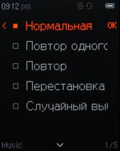 На экране во время воспроизведения отображается обложка альбома, если она вшита в тег. Если нет изображена стандартная картинка. Далее все обычно: имя артиста, название песни (названия альбома, кстати, не видно на экране), режимы эквалайзера и воспроизведения, полоса прогресса, порядковый номер трека, текущее время, заряд аккумулятора, подсказки-пиктограммы.
