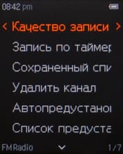 Имеется контекстное меню, состав и функциональность которого во многом повторяют предшествующую модель. Отмечу лишь положительные сдвиги и новые функции. Появился «Режим обучения», при котором из песни проигрывается только определенный, заданный вами отрезок времени. Появилась возможность устанавливать закладки, но судя по отзывам владельцев, эта возможность появилась и в T6 в новых прошивках. Можно изменять скорость сканирования (скорость перемотки внутри трека), скорость воспроизведения, включать/отключать отображение текста песни, если тот вшит в тег. Ну и, разумеется, настройки звучания: пятиполосный эквалайзер, уже настроенные предустановки, SRS WOW HD, Fade In (плавное нарастание звука). Никуда не делась важная многим возможность просмотра дополнительной информации о треке такой, как битрейт, частота дискретизации, название альбома, и прочей.