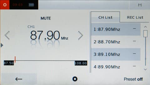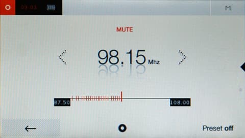 Приемник способен принимать частоты от 76 до 108 МГц (при установленном в настройках японском регионе). Имеются все стандартные возможности ручной и автоматический поиски, 30 ячеек для запоминания нужных частот.