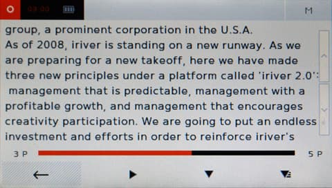 Для того, чтобы листать страницы, около правого края экрана имеется две продолговатые и узкие кнопки «Вверх» и «Вниз», которые «благодаря» алюминиевой границе корпуса, и, как следствие, утопленному вниз экрану, нажимать крайне неудобно. Есть еще один способ листать текст: проводить пальцем вверх/вниз по экрану. Имеется режим полноэкранного просмотра, для этого надо нажать по центральной области текста, и вот при пролистывании часто получается так, что плеер просто выходит из полноэкранного режима, принимая жест пролистывания за нажатие в центр. В общем, не очень логично сделана «читалка», немногих усилий стоило бы сделать более адекватное управление.
