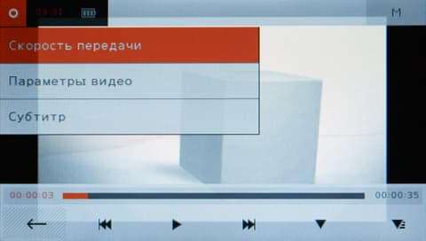 В режиме видео плеер проигрывал два фильма из внутренней памяти. Первый в формате AVI, кодек XviD, 24 кадра в секунду, разрешение 688x288, битрейт аудио MP3 128 Кбит/с, битрейт видео 745 Кбит/с. Второй файл тоже AVI, кодек DivX 5, 25 кадров в секунду, разрешение 720x404 пикселя, звук в формате Dolby AC3 с битрейтом 160 Кбит/с, битрейт видео 1800 Кбит/с. Второй файл был специально выбран потяжелее, ибо в реальных условиях вряд ли все файлы, которые пользователи будут загружать в плеер, будут в рамках рекомендованных параметров. Но даже в таком режиме плеер умудрился отыграть 7,5 часов.