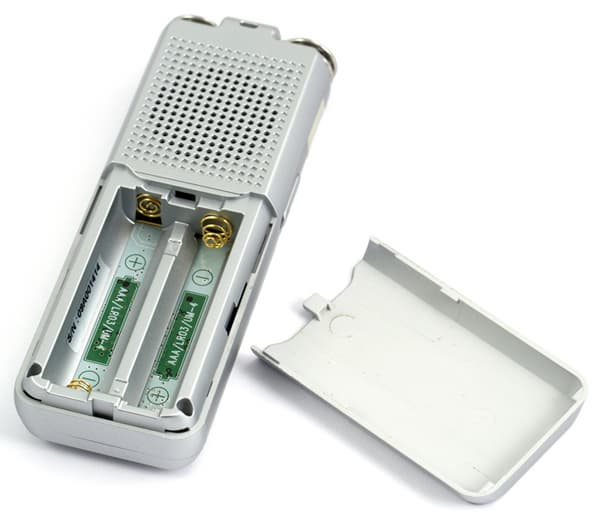 Диктофон работает от двух батареек типа AAA. В инструкции написано, что в комплекте идут аккумуляторы, но это не так — только обычные щелочные батарейки. Заявлено, что диктофон способен записывать звук в самом низком качестве в течение 55 часов. При записи в хорошем качестве, от 128 до 1411 Кбит/с, эти цифры, конечно же, сократятся, причем намного. Диктофон израсходовал заряд двух батареек за два с половиной — три часа записи, но следует учесть, что много времени было потрачено на изучение функций, прослушивание записей и немного музыки.