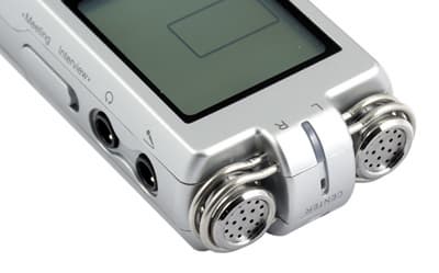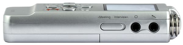 На левом торце находятся гнезда для наушников и внешнего микрофона, а также переключатель режимов Meeting и Interview.