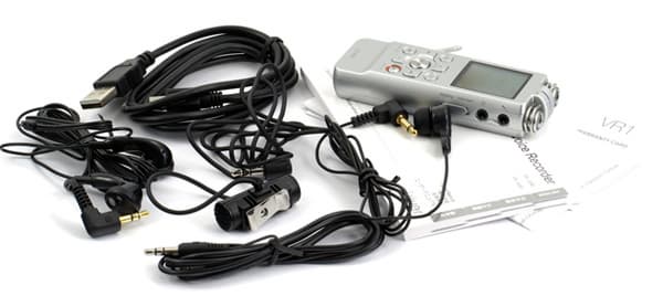 С диктофонами помимо наушников часто в комплекте можно найти всякого рода бонусы. У этой модели их предостаточно. Во-первых, имеются наушники — как на вид, так и по звуку не впечатляющие. Во-вторых, есть внешний стереомикрофон с прищепкой для одежды. В-третьих, есть замаскированный под наушник-затычку еще один микрофон, уже монофонический. Он вставляется в ухо и напоминает обычный наушник, но звук не воспроизводит — лишь записывает его. В-четвертых, кабель «джек»-«джек» для записи с каких-либо устройств, например с аудиоплеера или магнитофона.