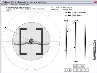 Проверка качества позиционирования источников звука при использовании DirectSound3D. Производится субъективное прослушивание на трёхмерной сцене с движущимся источником звука и возможностью его интерактивного перемещения пользователем в трёхмерном пространстве. Этот тест поддерживает все основные фичи EAX4 Advanced HD. - RightMark 3DSound: CPU Utilization test