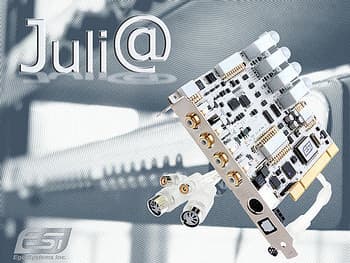 Корейско-японская компания ESI отметилась в 2004 году выпуском ESI Juli@ — это профессиональная звуковая карта необычного дизайна, одновременно с профессиональными и бытовыми разъемами для подключения. Карта — разборная, состоит из двух частей. Верхняя часть поворачивается на 180 градусов, позволяя выбрать требуемые разъёмы и уровень сигнала (бытовой -10 dBV, профессиональный +4 dBU). Карта также имеет интересную реализацию аппаратного мониторинга сигналов с нулевой задержкой, за счёт применения для стереовыхода 8-канального ЦАПа. Читайте нашу статью, содержащую также эксклюзивное интервью с разработчиками.