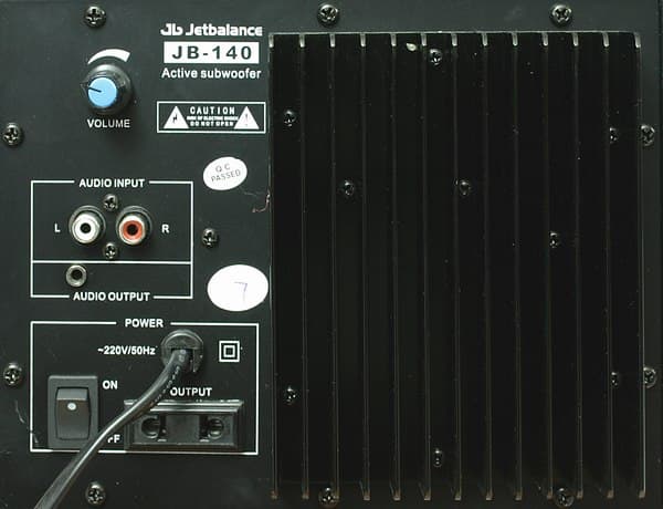 На задней стороне сабвуфера расположены ребра радиатора и панель коммутации. Панель включает в себя регулятор громкости сабвуфера, сквозной линейный вход и выход, выключатель питания и розетка питания (220 В), например, для подключения активных стереоколонок.