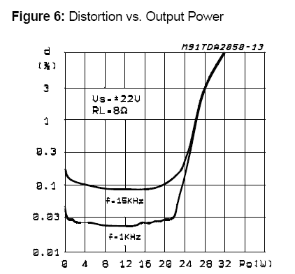 В качестве усилительных микросхем производитель использует две мономикросхемы TDA 2050 от STMicroelectronics, по одной для каждого динамика. Давайте взглянем на графики зависимости искажений от мощности, взятые из спецификации на микросхему для напряжения питания ±22 В.