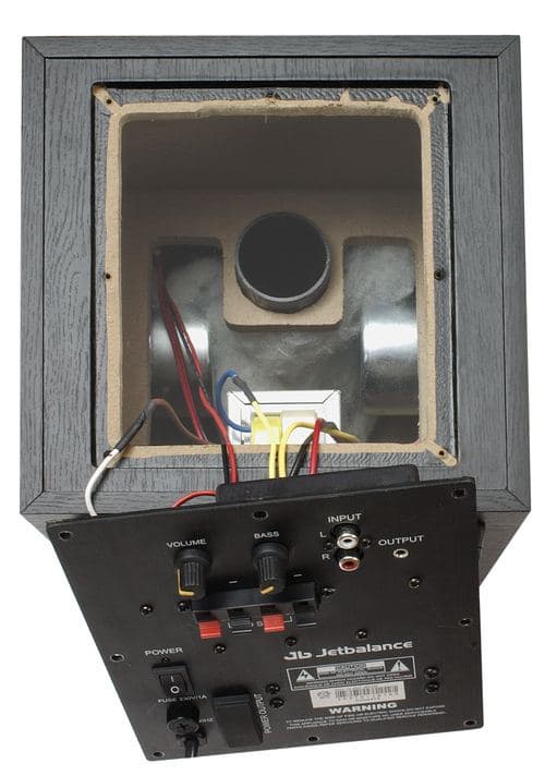 Внутри корпуса предусмотрена панель, разделяющая пространство на две равные камеры. Панель также служит распоркой, предотвращающей паразитные вибрации стенок корпуса на больших уровнях громкости. В той части, где расположены динамики, пространство заполнено звукопоглощающим материалом. С другой стороны располагается Ш-образный трансформатор и плата с элементами.