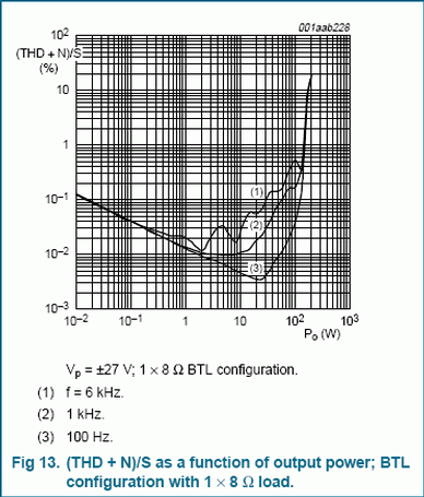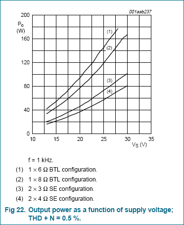 Из приведенных графиков следует, что при напряжении питания ±27 В микросхема TDA 8920B развивает мощность до 120 Вт при уровне искажений 0,5%.