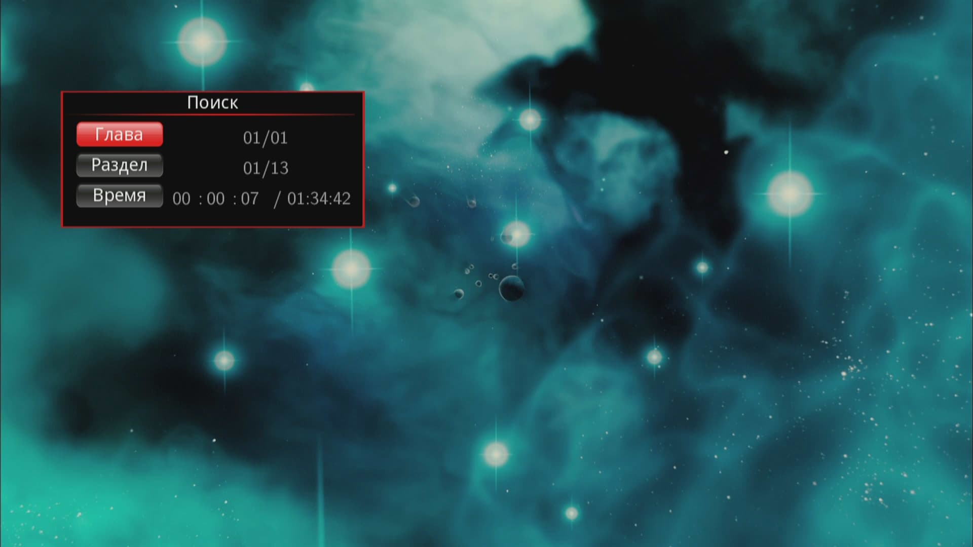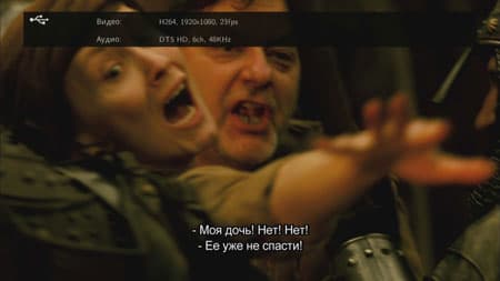 Однократное нажатие кнопки Info во время воспроизведения выводит на экран краткую информацию о текущем времени воспроизведения и имени воспроизводимого файла. Для того чтобы увидеть информацию о формате проигрываемого контента, требуется нажать кнопку Info ещё раз.