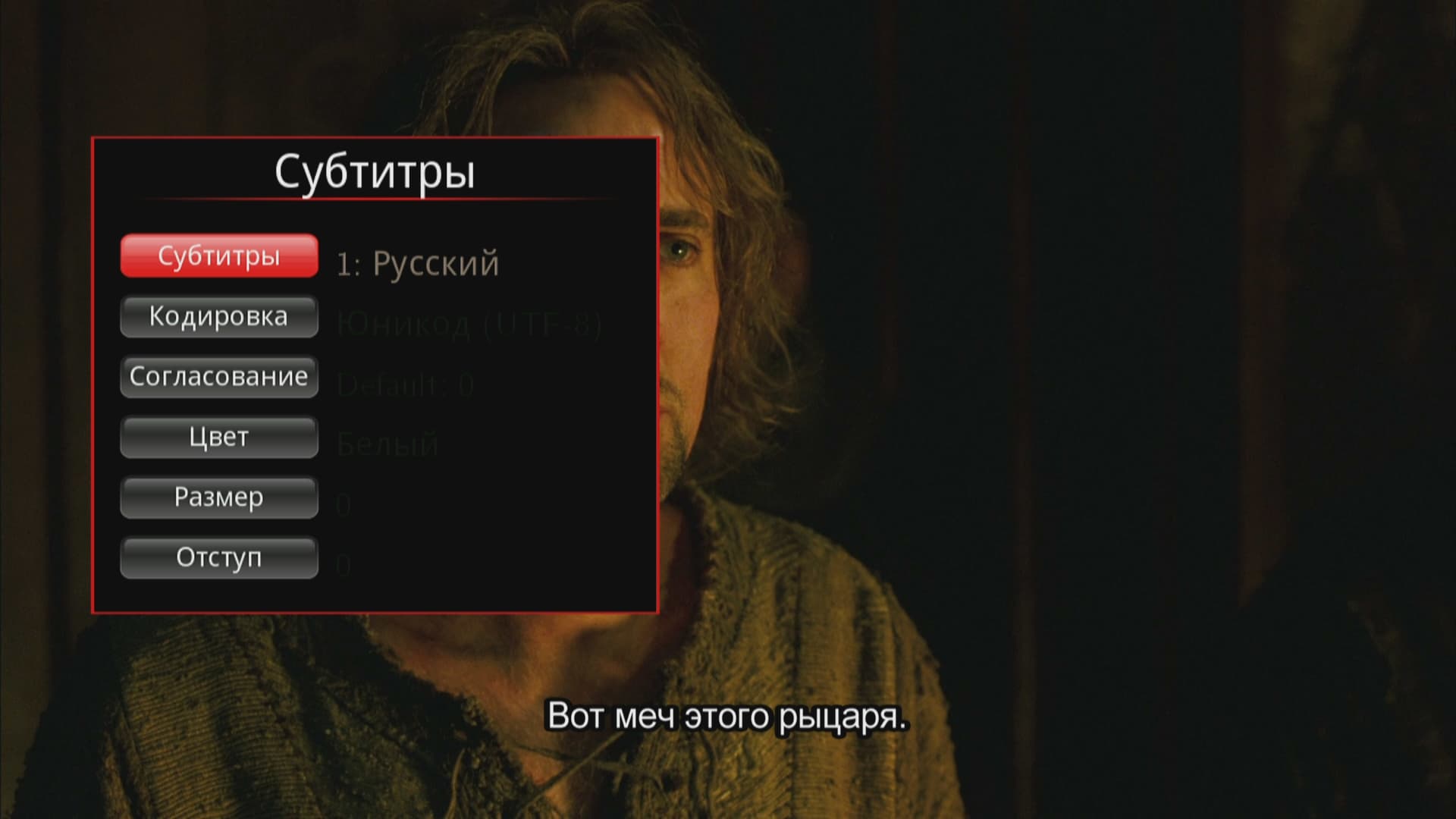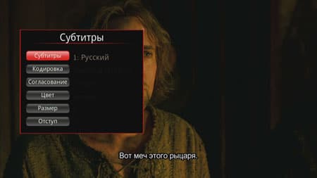 Выбор звука или дорожки субтитров производится соответствующими кнопками на пульте ДУ, здесь тоже всё стандартно: выбор субтитров, их кодировки и настройка прочих параметров.