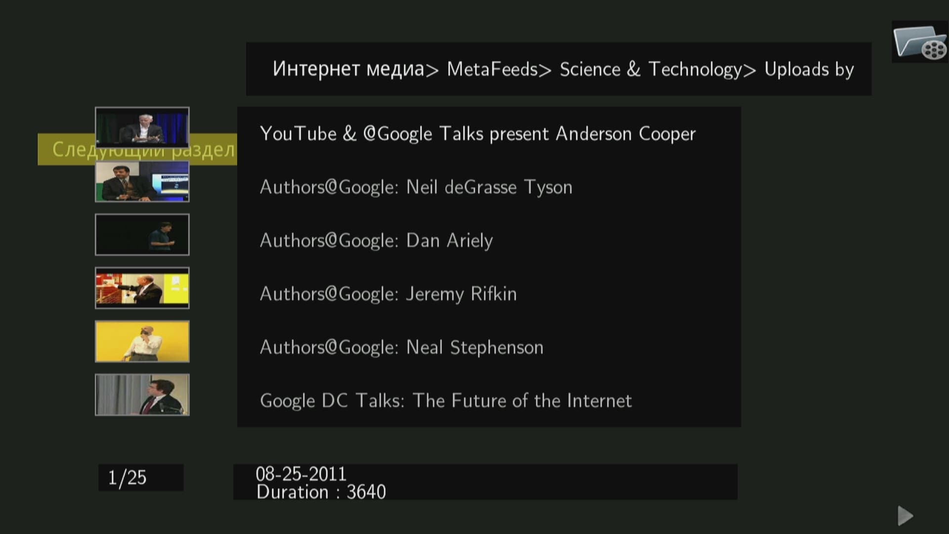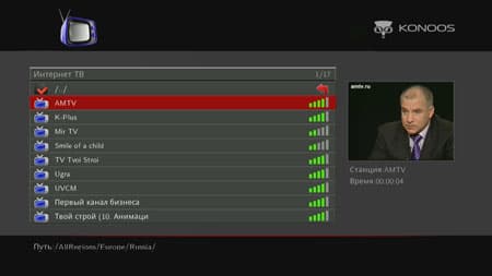 И, наконец, последний пункт главного меню — Интернет ТВ. Оформлен он в виде файлового браузера с добавлением занимательных иконок; доступные здесь главные категории таковы: Жанры, Страны, Языки, Избранное, История просмотров. При выборе конкретного канала вещания в правой части окна отображается живая картинка трансляции. Правда, без звука. Чтобы его услышать, нужно запустить просмотр в полноэкранном режиме.