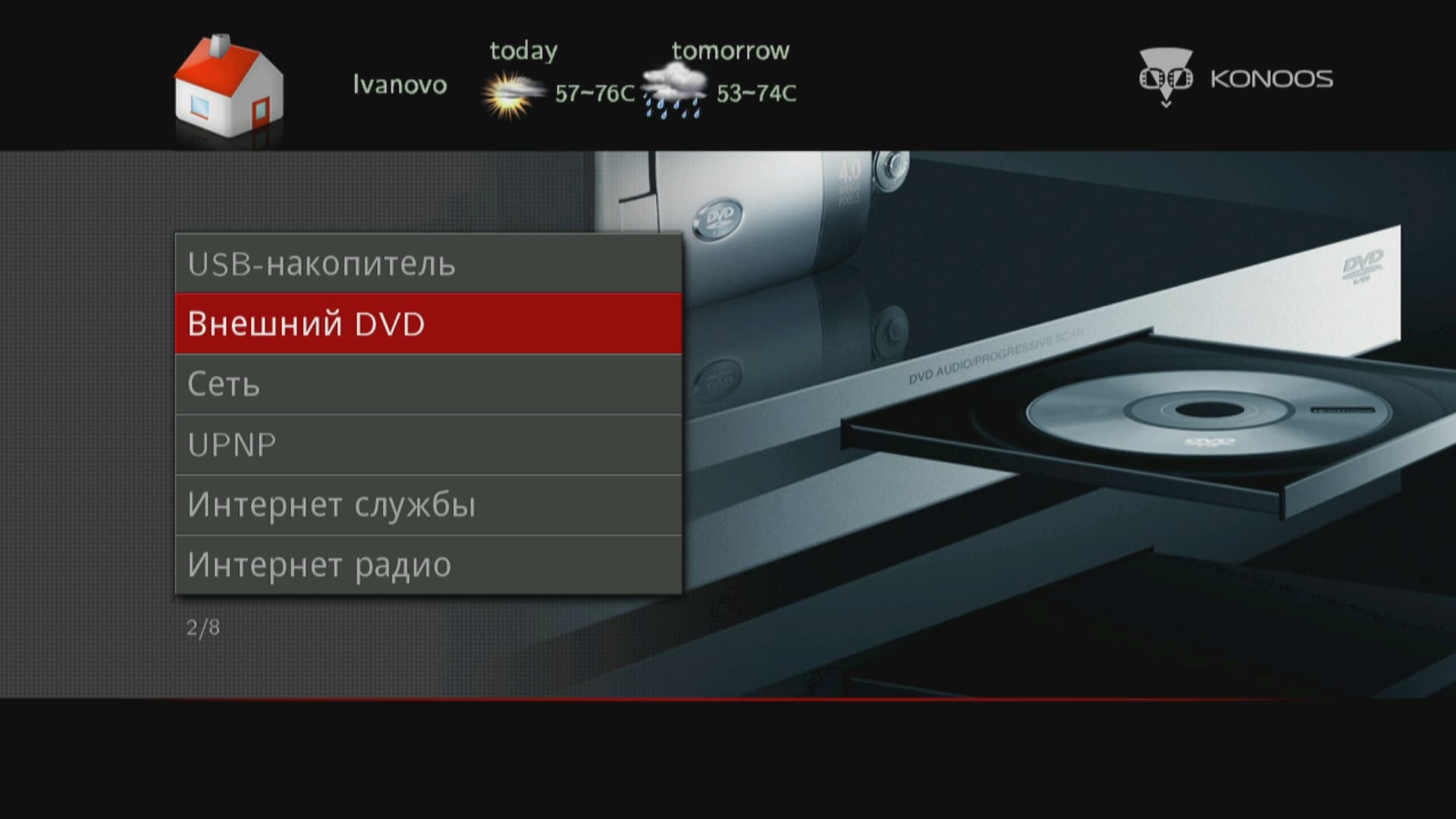 Всего в главном меню восемь пунктов: USB-накопитель, Внешний DVD, Сеть, UPNP, Интернет службы, Интернет радио, Интернет ТВ и Настройки. Вот с настроек, пожалуй, и начнём.