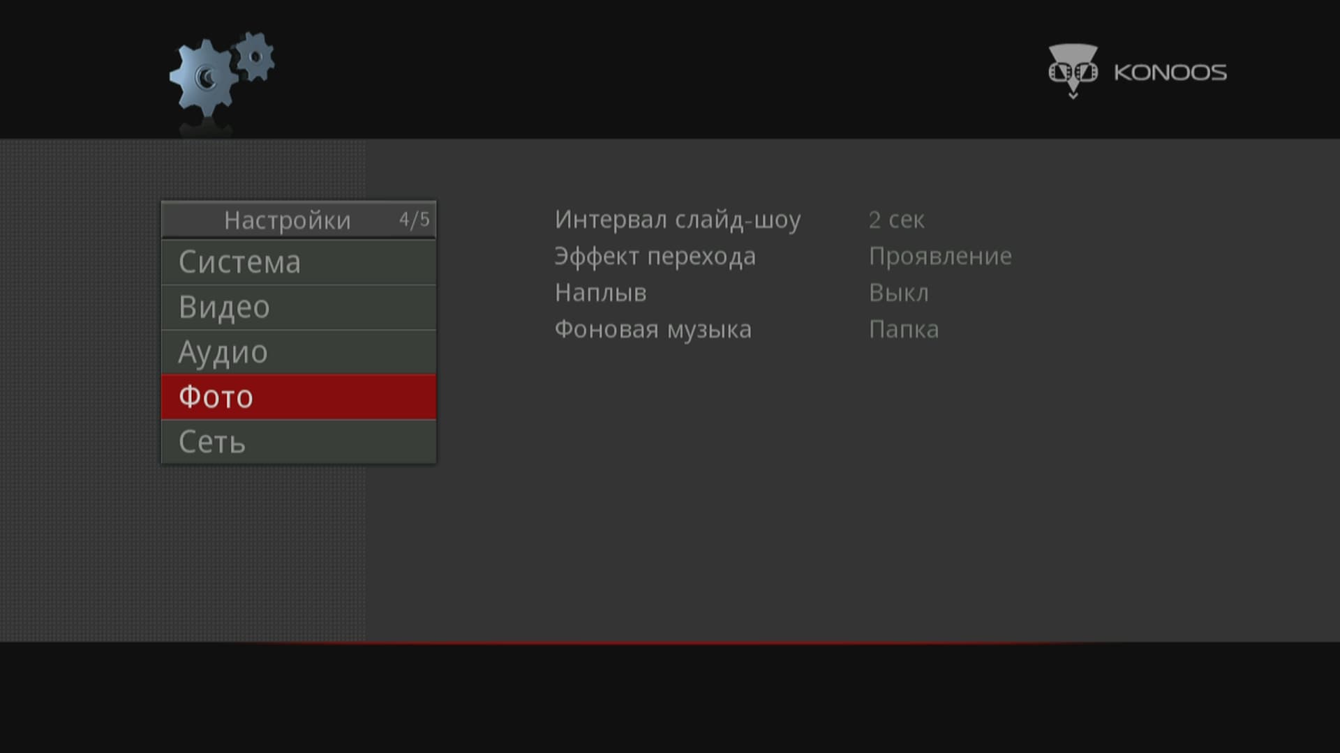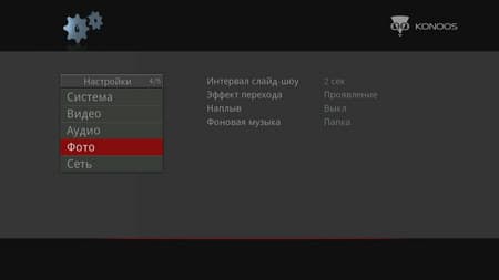 В пункте Фото настраивается поведение плеера при воспроизведении фото-слайд-шоу, интервал смены фотографий возможно установить от 2 секунд до 2 минут, а также выбрать один из восьми типов переходов.
