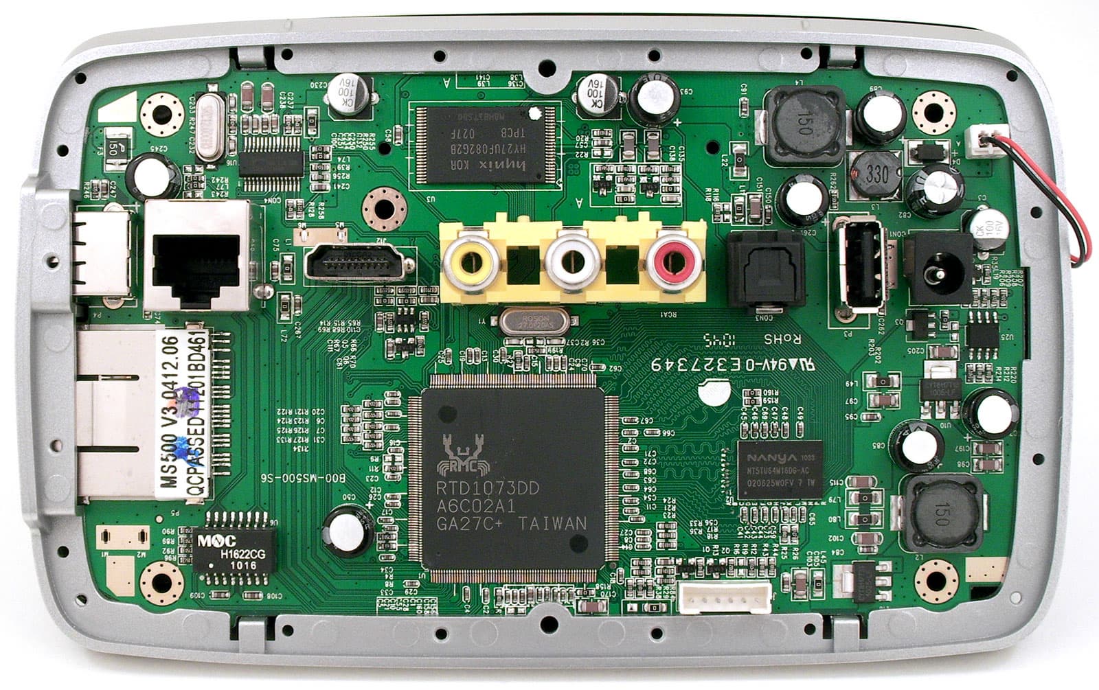 Если перевернуть плату, в первую очередь бросается в глаза тот самый виновник нагрева — процессор Realtek RTD1073DD. На этом чипе построено множество недорогих домашних мультимедиаплееров; данная микросхема не является новинкой, она выпущена в позапрошлом, 2009 году. Однако дополнительные символы в маркировке чипа (DD) указывают на наличие встроенного DTS-декодера. Значит, меломаны, не обладающие ресиверами, могут порадоваться.