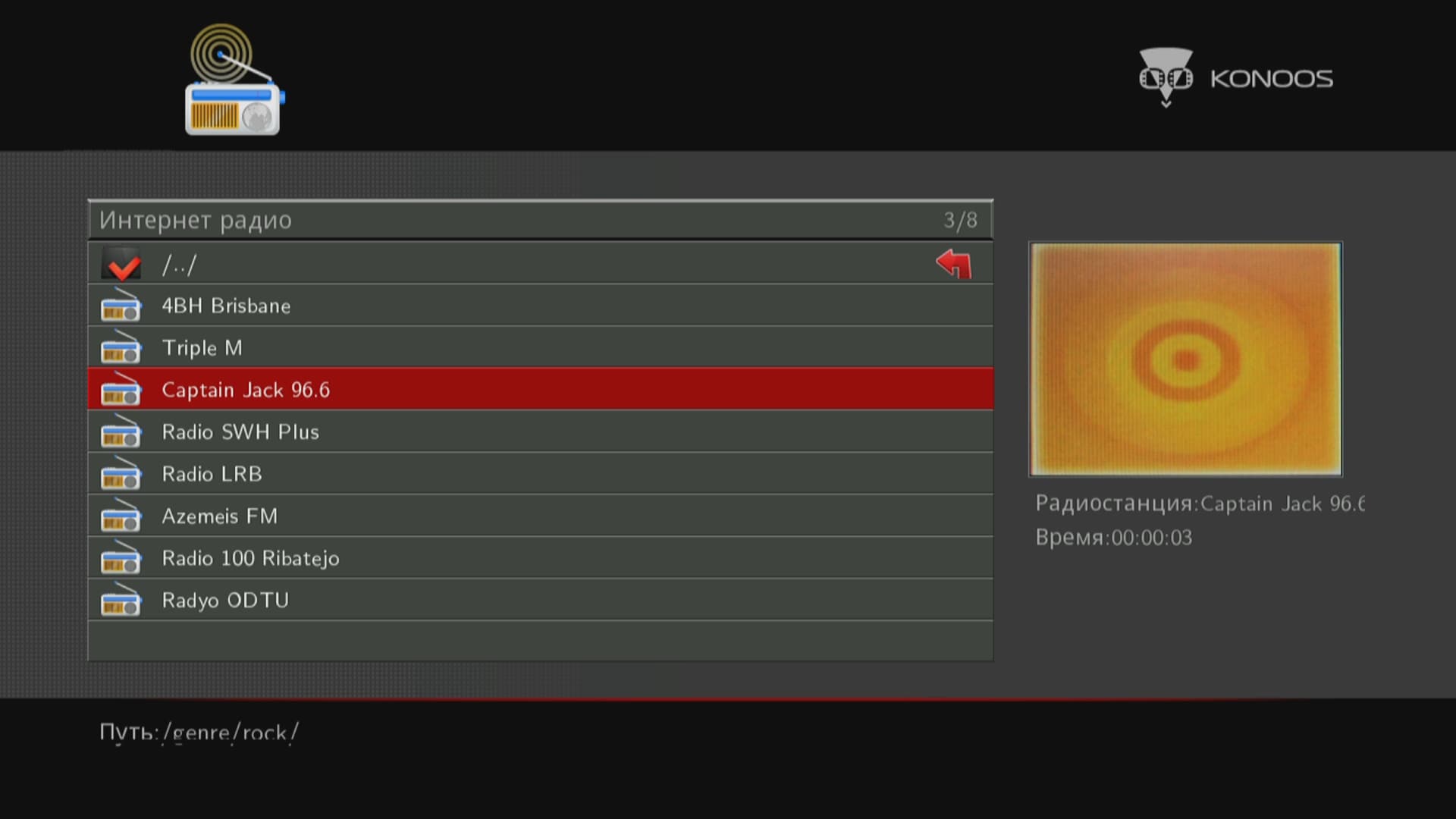 Интернет-радио, вход в которое осуществляется непосредственно из главного меню плеера, состоит из категорий, на которые разбиты вещающие радиостанции: жанр, страна и т. д.