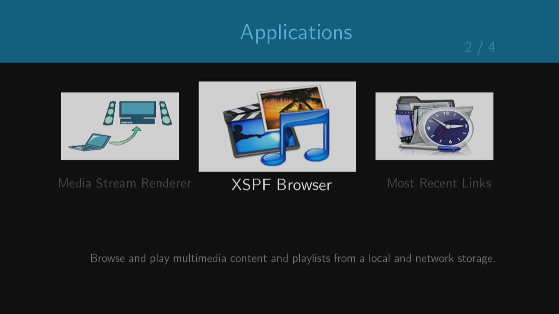 Что касается пункта Приложения, то он состоит из трёх ресурсов: Media Stream Renderer (этот сервис мы подробно рассматривали в обзоре другого плеера), XSPF Browser (файловый браузер и плеер, альтернативные «умолчальным») и Most Recent Links (и по названию понятно, что здесь хранятся ссылки на недавно просмотренный или прослушанный контент). В общем, эти Приложения — суть ещё один программный плеер в плеере, вторая оболочка.