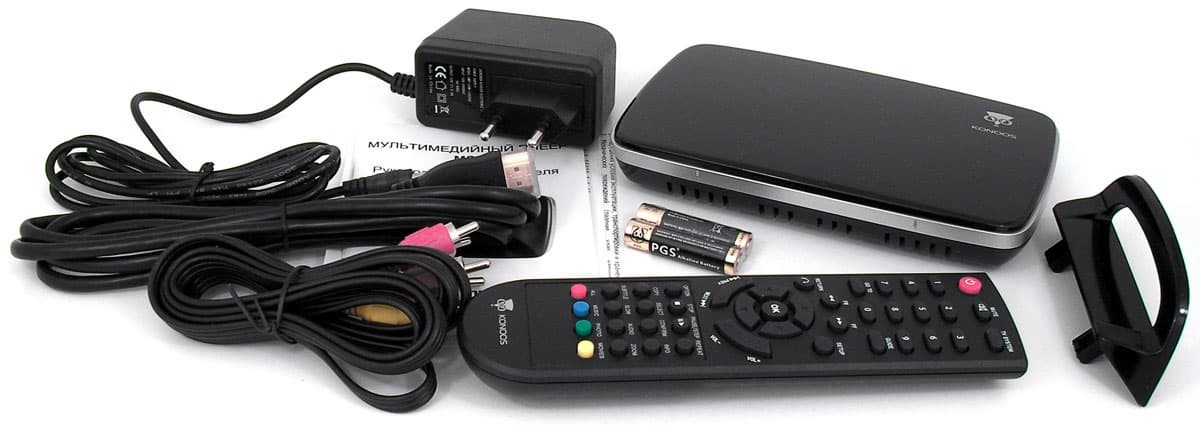 Комплектность — она вполне стандартна для большинства предлагаемых на рынке медиаплееров, за одним приятным исключением: помимо привычных композитных аудио/видеотюльпанчиков в коробке нашлось место и для HDMI-кабеля. Также здесь имеются адаптер питания, пульт ДУ с батарейками, кронштейн-подставка и немного документации, включая краткое руководство и диск с руководством пользователя в формате PDF.
