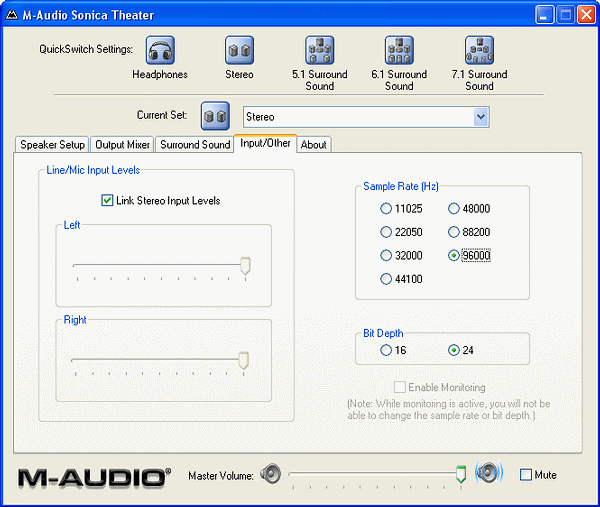 На вкладке Input/Other панели с левой стороны располагаются индикатор и регулятор входного уровня сигнала. С правой стороны расположены настройки разрядности и частоты семплирования.