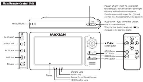 В принципе, дисплей по размерам не сильно отличается от ранее используемых в этом классе устройств, так что и компоновка совершенно «классическая», да и внешне Т600 на первый взгляд легко спутать с более старыми плеерами. Схема разделки устройства, равно как и прилагаемого к нему ПДУ приведена на рисунке ниже: