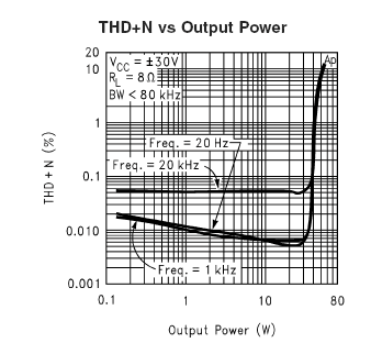 Судя по приведенным диаграммам, используемая микросхема развивает мощность 30 Вт при уровне искажений, не превышающем 0,1%.