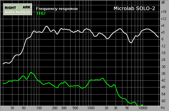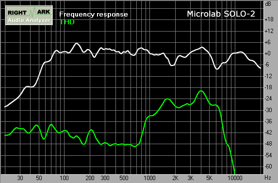 Неравномерность АЧХ на средних частотах превосходна! Она составляет всего ± 4 дБ. Искажения составляют величину менее 1% (-40 дБ). А ведь уровень громкости во время теста очень приличный. В реальной жизни колонки эксплуатируются на намного более низкой громкости. Неравномерность на высоких на самом деле не такая страшная, при смещении измерительного микрофона от положения между двумя динамиками к положению на оси ВЧ-динамика провалы в АЧХ в области высоких сглаживаются, однако даёт о себе знать диаграмма направленности СЧ/НЧ-динамика.