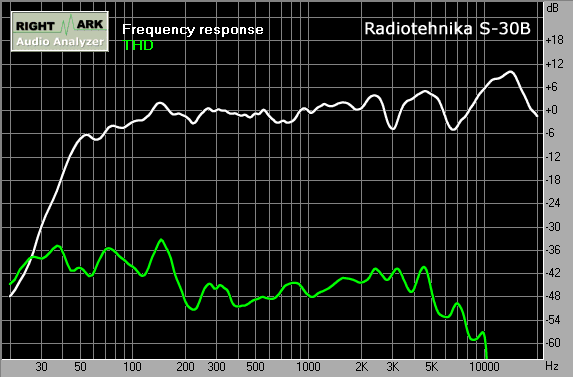 У колонок Radiotehnika S-30B низкие завалены (у штатных, набитых ватой, с басами всё обстоит ещё хуже), средние очень даже приличные, высокие сильно изрезаны и выпирают на +10 дБ от среднего уровня. Диагноз на помойку.