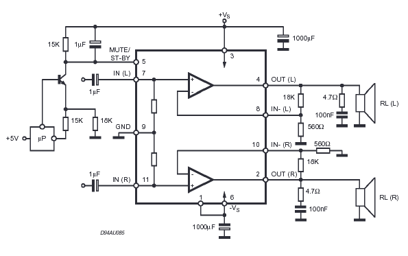Усилитель TDA7265 в нашем случае используется в типовом включении, так что для рассмотрения работы мы можем использовать приведённую в документации принципиальную схему. Из неё видно, что для управления режимом работы используется усилитель напряжения на транзисторе (на плате это операционник JRC 4558).