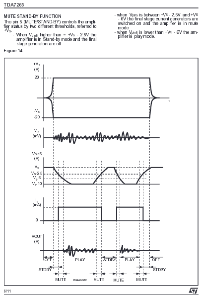 Как видно из пояснений в документации на ST TDA7265, за отключение звука и переход в энергосберегающий режим отвечает пятая ножка этой микросхемы.