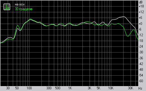 Характер АЧХ полностью соответствует измеренной характеристики предыдущей модели. Все тот же подъем на граница диапазона, который благотворно сказывается на паспортных параметрах, увеличивая диапазон частот. Низких частот, судя по графику, даже многовато. В реальной ситуации эффективность работы фазоинвертора зависит от расположения колонок относительно стола и стены. Наши измерения соответствуют поведению АС в четверть-пространстве (стол и стена, вдали от углов).