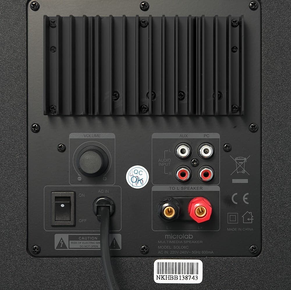 На задней панели колонок расположены два равноправных входа, AUX и PC — стерео RCA разъемы. Текущий вход выбирается с пульта ДУ. Регулятор громкости на задней панели дублирует пульт. Это цифровой безупорный регулятор. Механический выключатель питания на задней панели сбрасывает установку громкости и тембров.