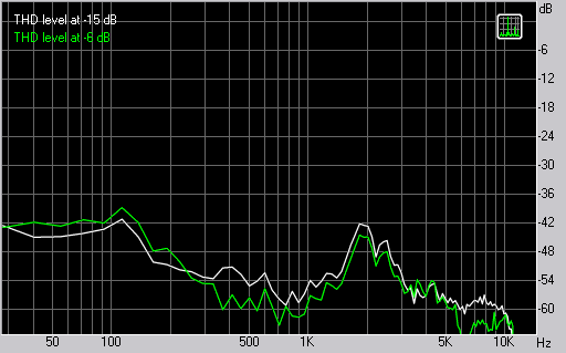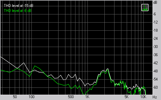 Начиная с 2,5 кГц в работу вступает ВЧ-динамик и мы вновь видим низкое количество искажения, стремящееся к 0,1%.